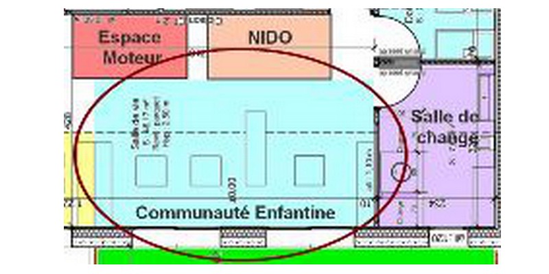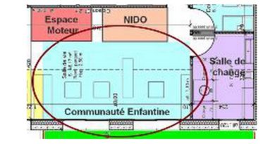 L’espace Nido se situe le long du mur au niveau des deux dortoirs afin que cet espace reste un lieu calme en respectant les différents rythmes de sommeil de chacun. Ce lieu est aussi stratégique, car il permet au tout-petit une observation des plus grands en toutes circonstances, que ce soit dans l’espace moteur ou l’espace communauté enfantine. Il favorise également une présence continue de l’adulte qui soutient le tout-petit dans ses acquisitions par une attention et une présence continue.