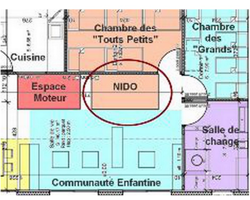 L’espace Nido se situe le long du mur au niveau des deux dortoirs afin que cet espace reste un lieu calme en respectant les différents rythmes de sommeil de chacun. Ce lieu est aussi stratégique, car il permet au tout-petit une observation des plus grands en toutes circonstances, que ce soit dans l’espace moteur ou l’espace communauté enfantine. Il favorise également une présence continue de l’adulte qui soutient le tout-petit dans ses acquisitions par une attention et une présence continue.