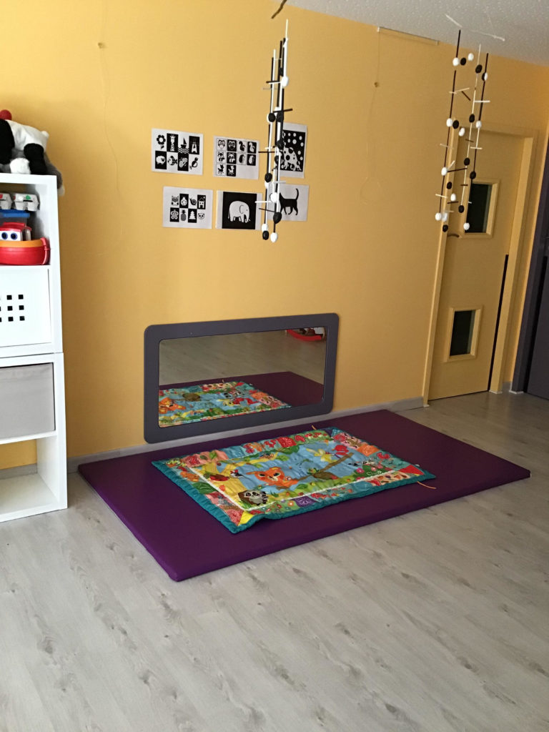 C’est un espace aménagé pour que le bébé puisse avoir un développement psychomoteur harmonieux. Les tapis au sol permettent au tout-petit de développer ses coordinations générales. Un dispositif visuel (images, miroir…) et du matériel tel que des hochets, tissus, balles, lui permettent l’acquisition des capacités de préhension et de coordination oculo-manuelle. La liberté de mouvement de l’enfant et le respect de son rythme sont également le gage d’une structuration spatiale et temporelle solide, laquelle est basée avant tout sur des repères corporels.
